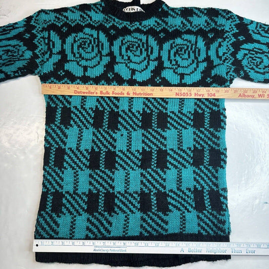 Vintage Sweater Robin Ross 80s Medium Colorful Teal Black Floral Tunic Jumper