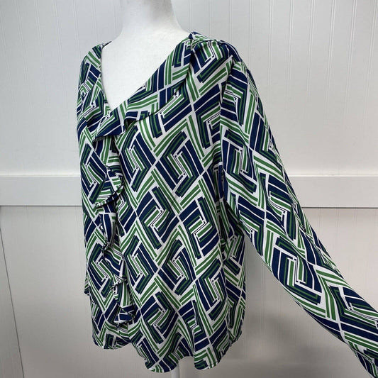 Zac & Rachel Blouse Sz 1X Green/Navy Blue Roll Tab Sleeve Bold Geometric Pattern