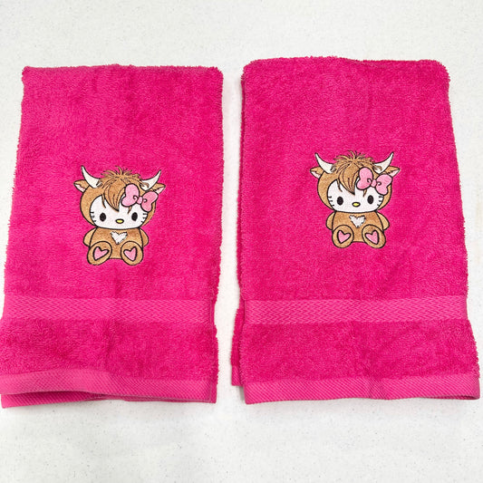 Hello Kitty Highland Cow Towels Embroidered Hand Towel Set Hot Pink Beige Cute Girly Bathroom Home Farm Decor