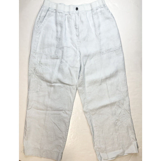 J Jill Linen Pants Womens 14 Petite Light Blue Wide Leg Ankle Floral Embroidery