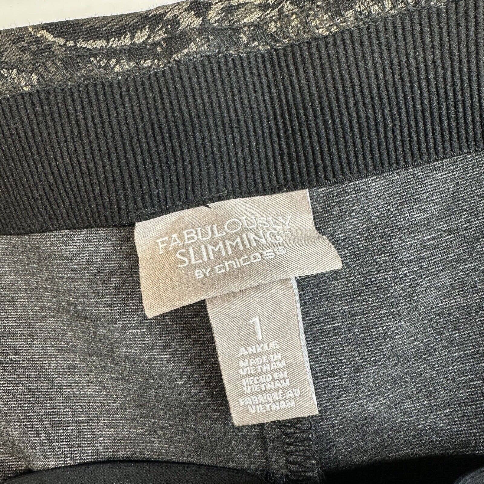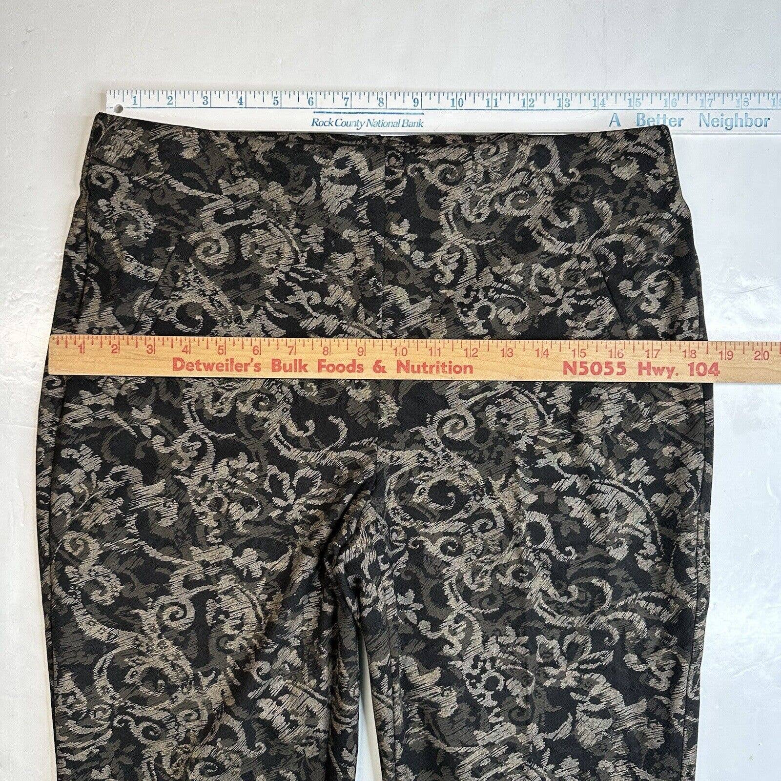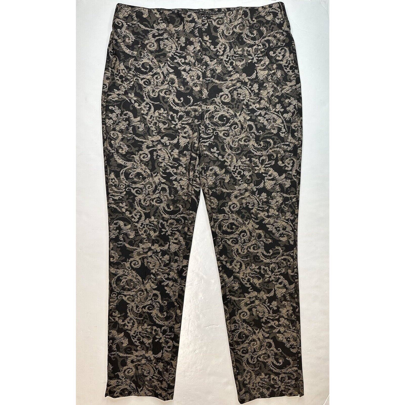 Chicos Ponte Knit Slim Ankle Pants Chico's Size 1 Womens (US 8/Medium) Tan Brown/Black Shimmer Floral Pattern Stretch Pull On Cropped Casual/Career/Work Pants. Slimming Tummy Panel, Elastic Waist And No Pockets.