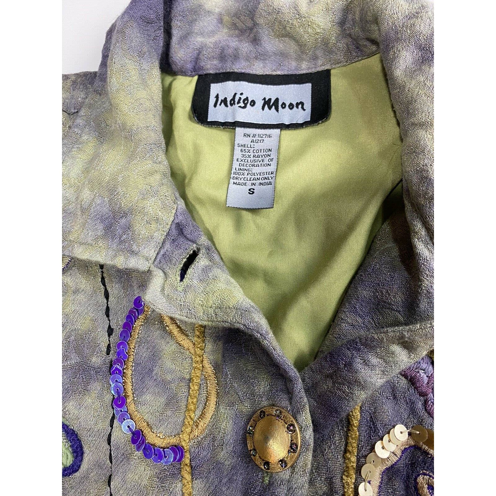 Indigo Moon Jacket Sz Small ART TO WEAR Sequins Flowers Embroidered Green/Purple Button Up
