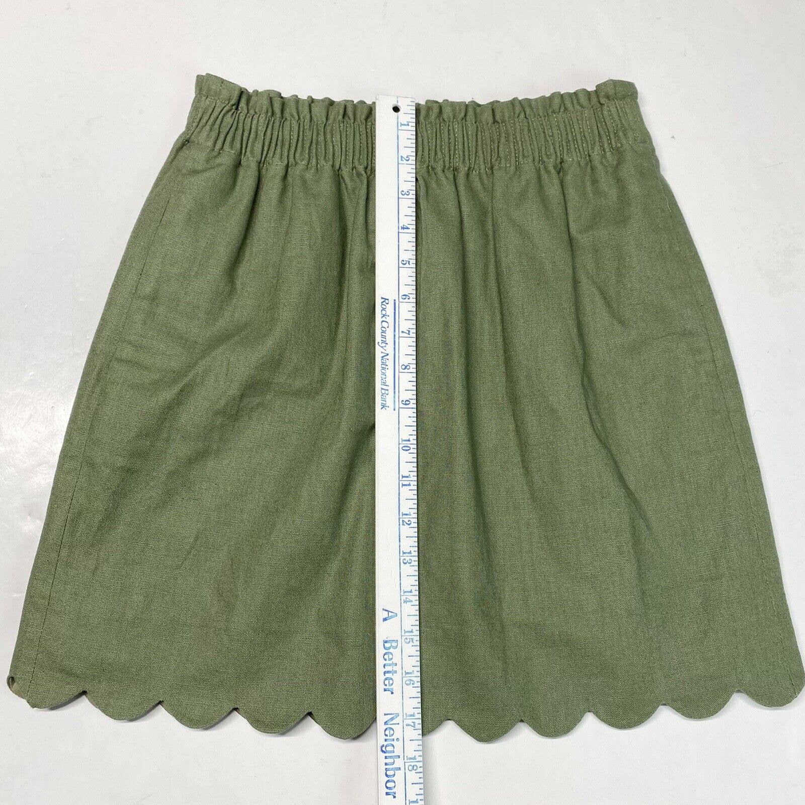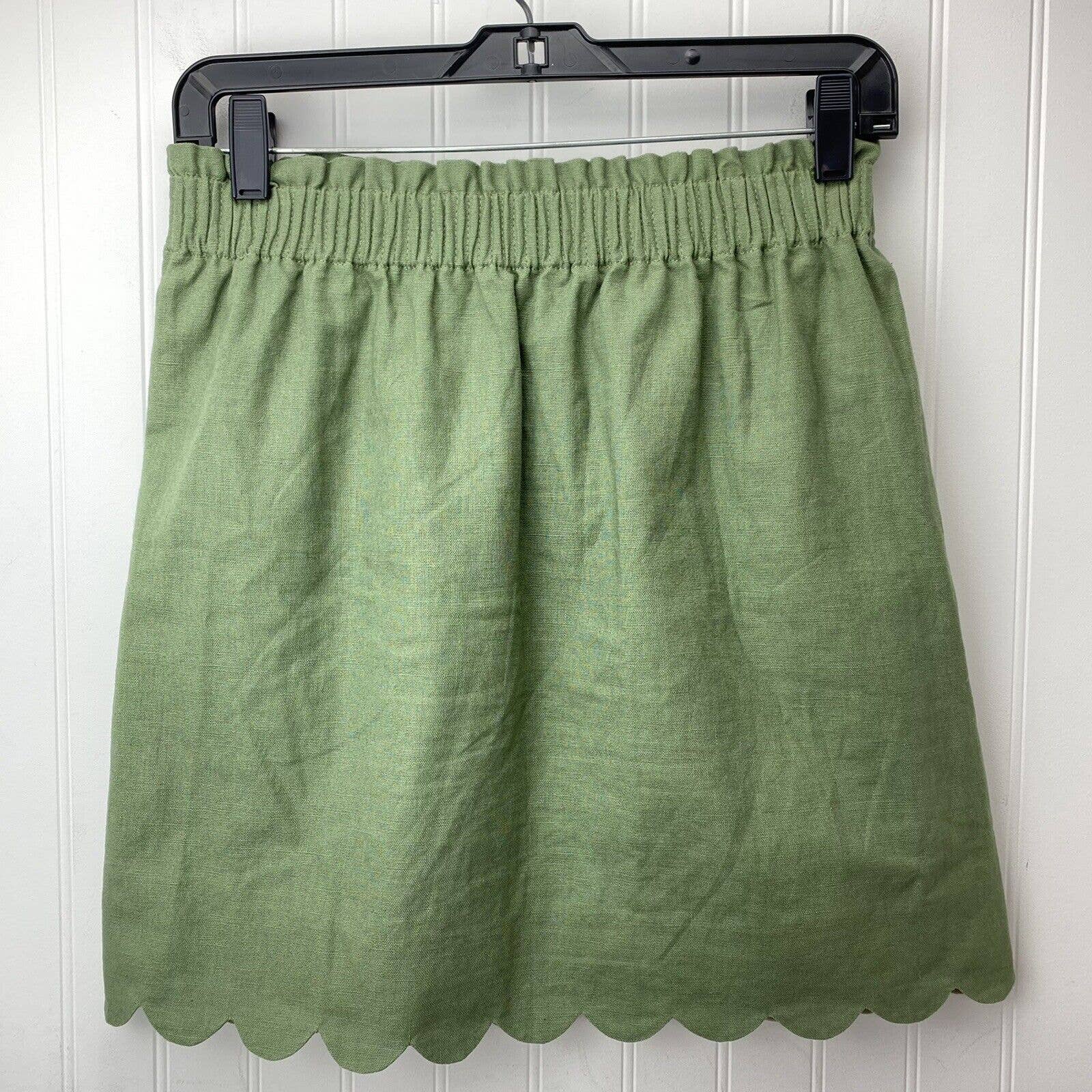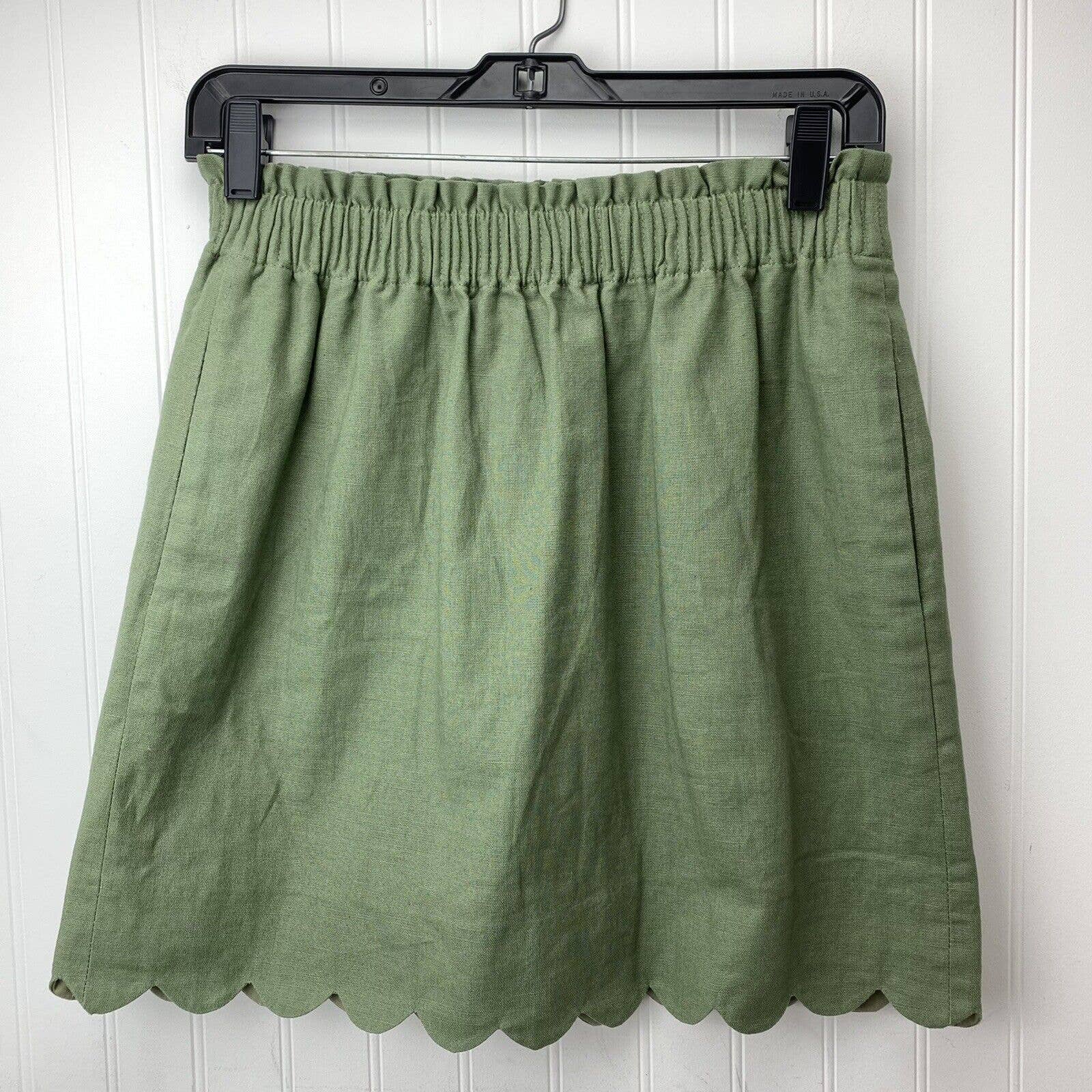 J. Crew Linen Cotton Blend Pull On Mini Skirt Sz 2 Womens Green Lined Short Skirt With Scalloped Hem, Elastic Waist And Pockets. Summer Beach Vacation