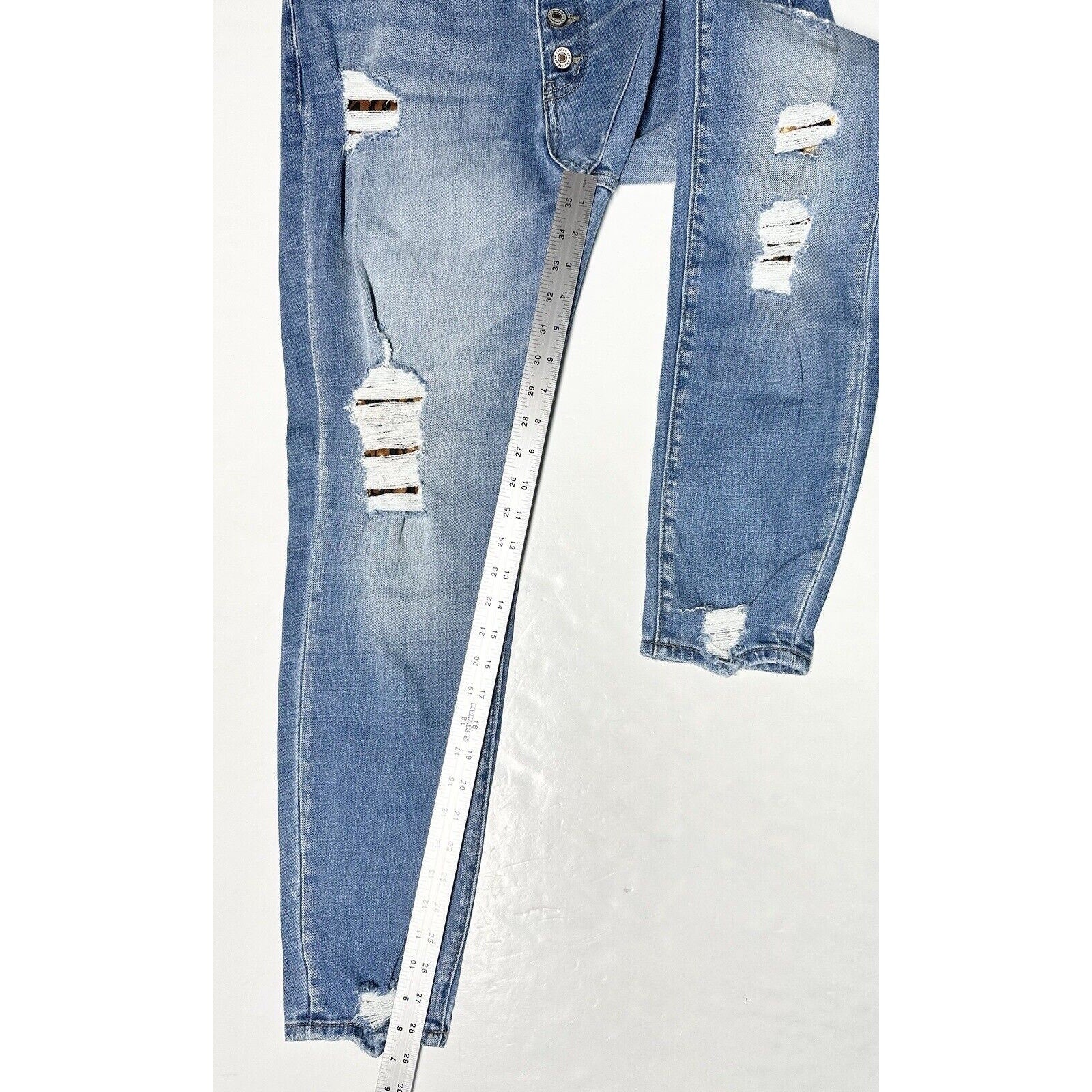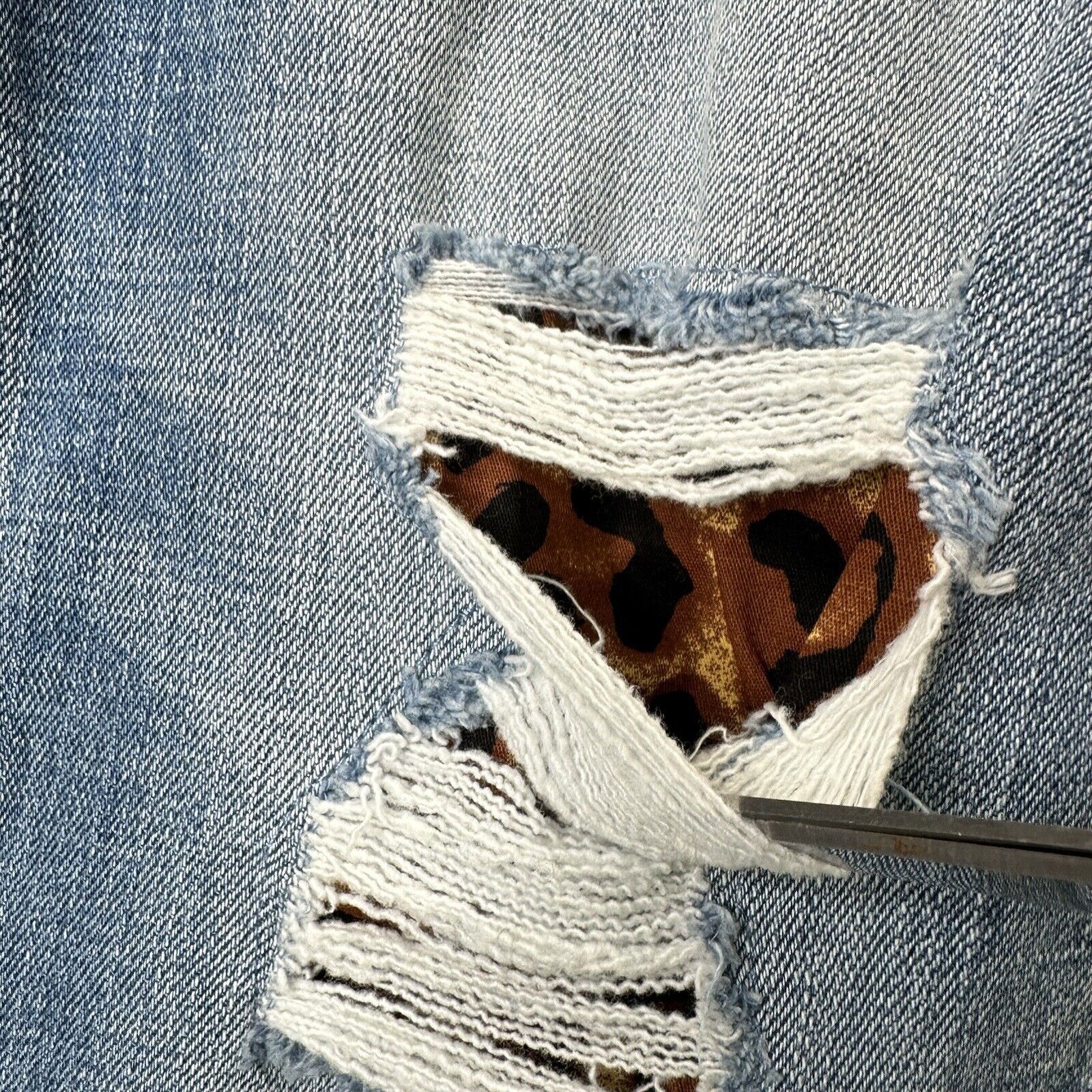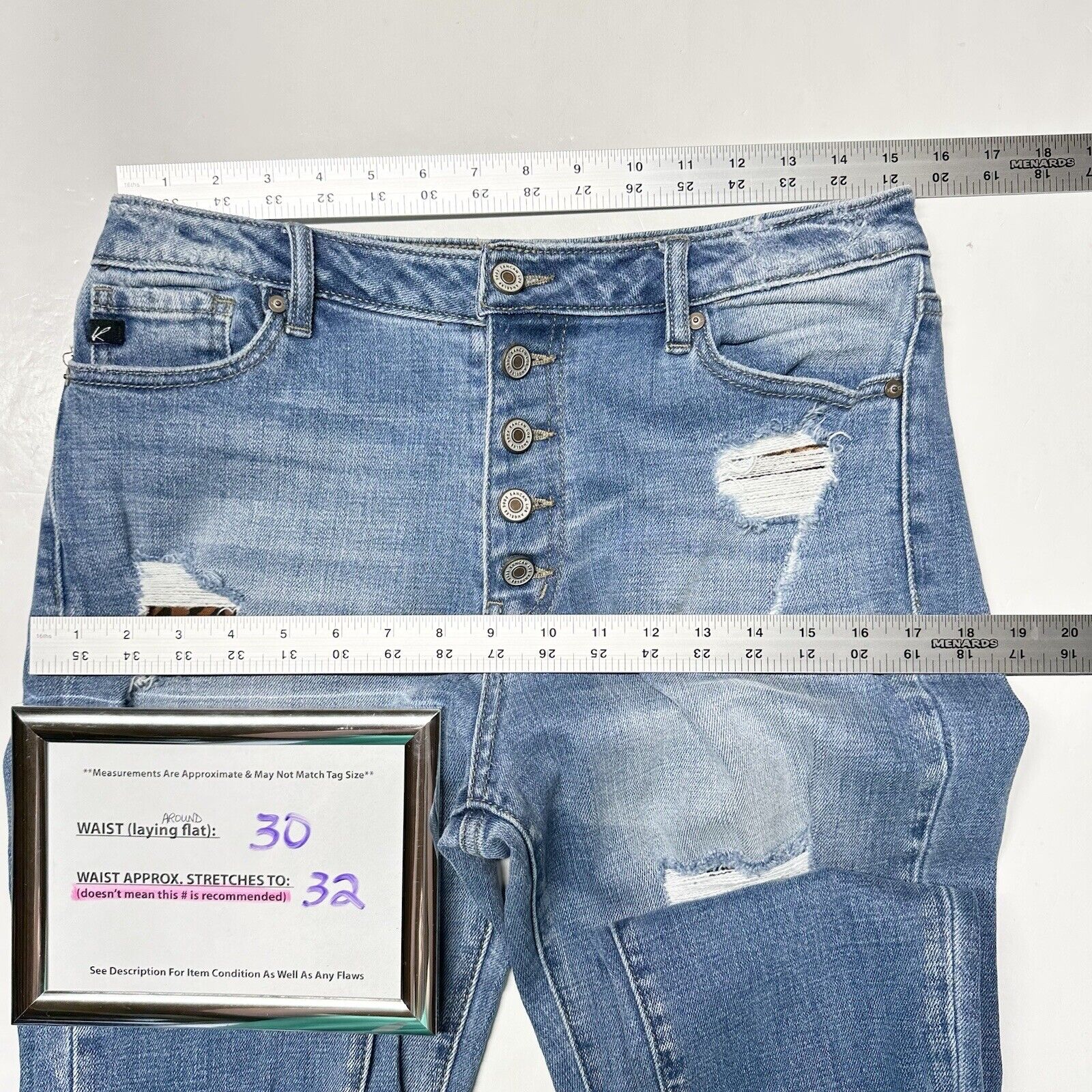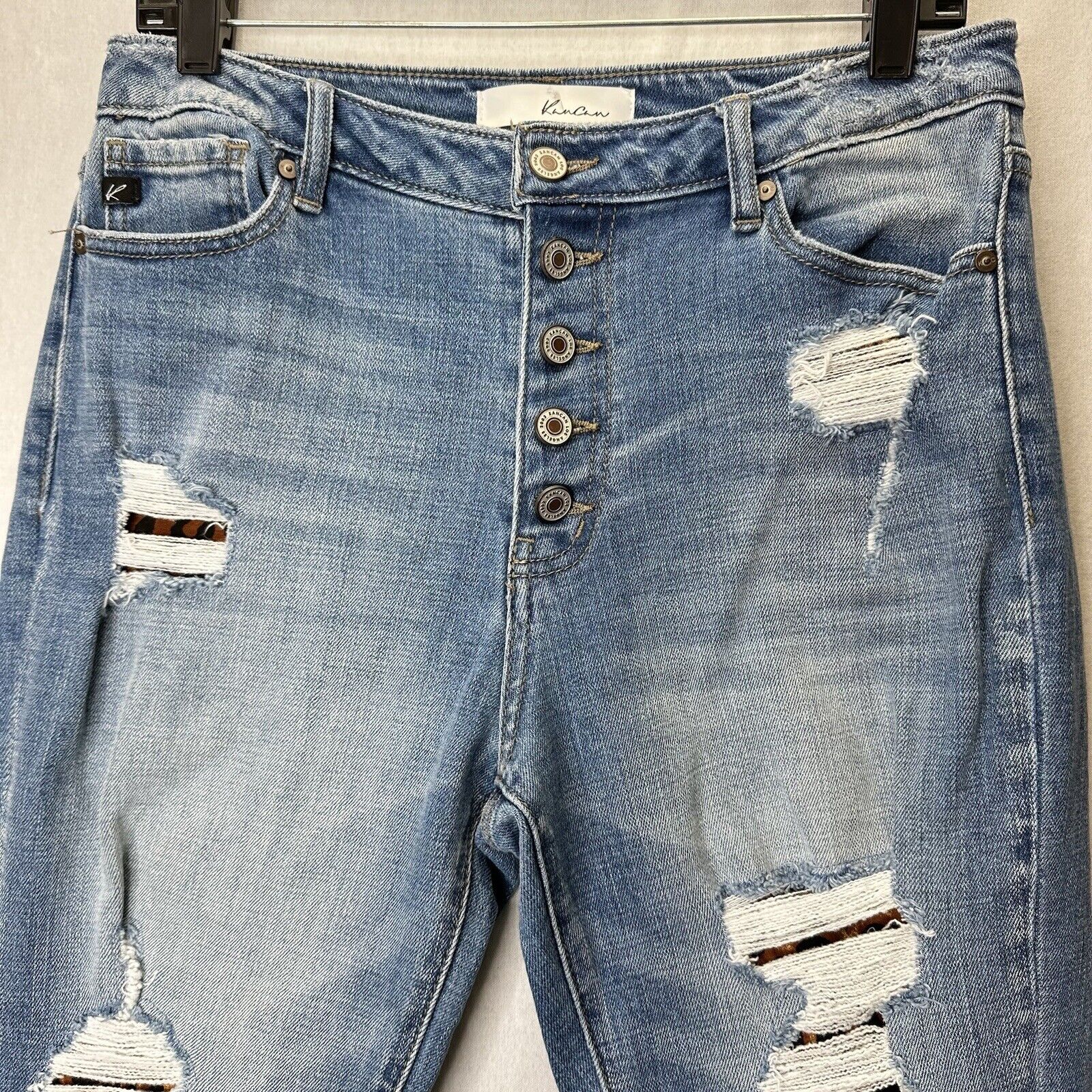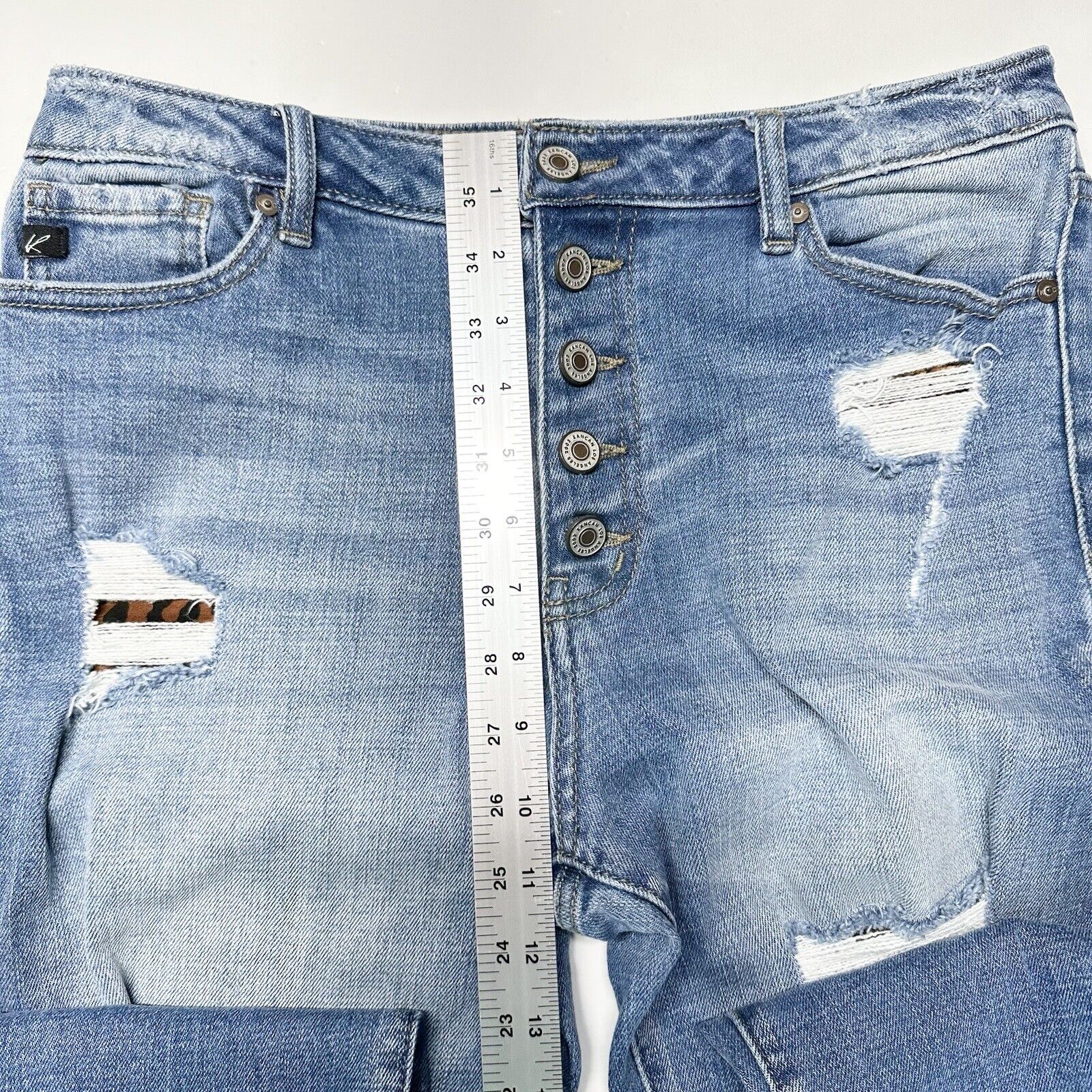 Kancan Jeans Womens 9 28 High Rise Skinny Blue Denim Button Fly Medium Wash Distressed Animal Print Cheetah Leopard Patching Underneath