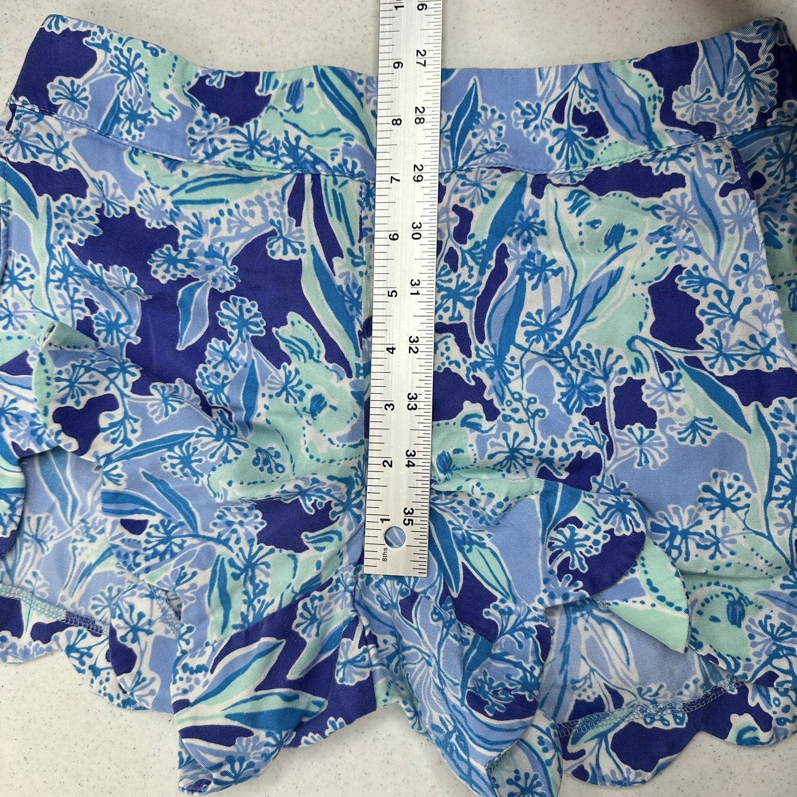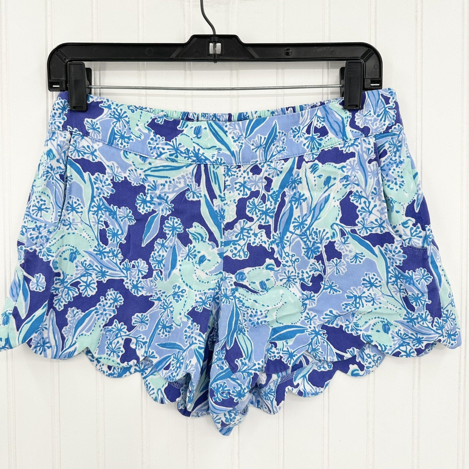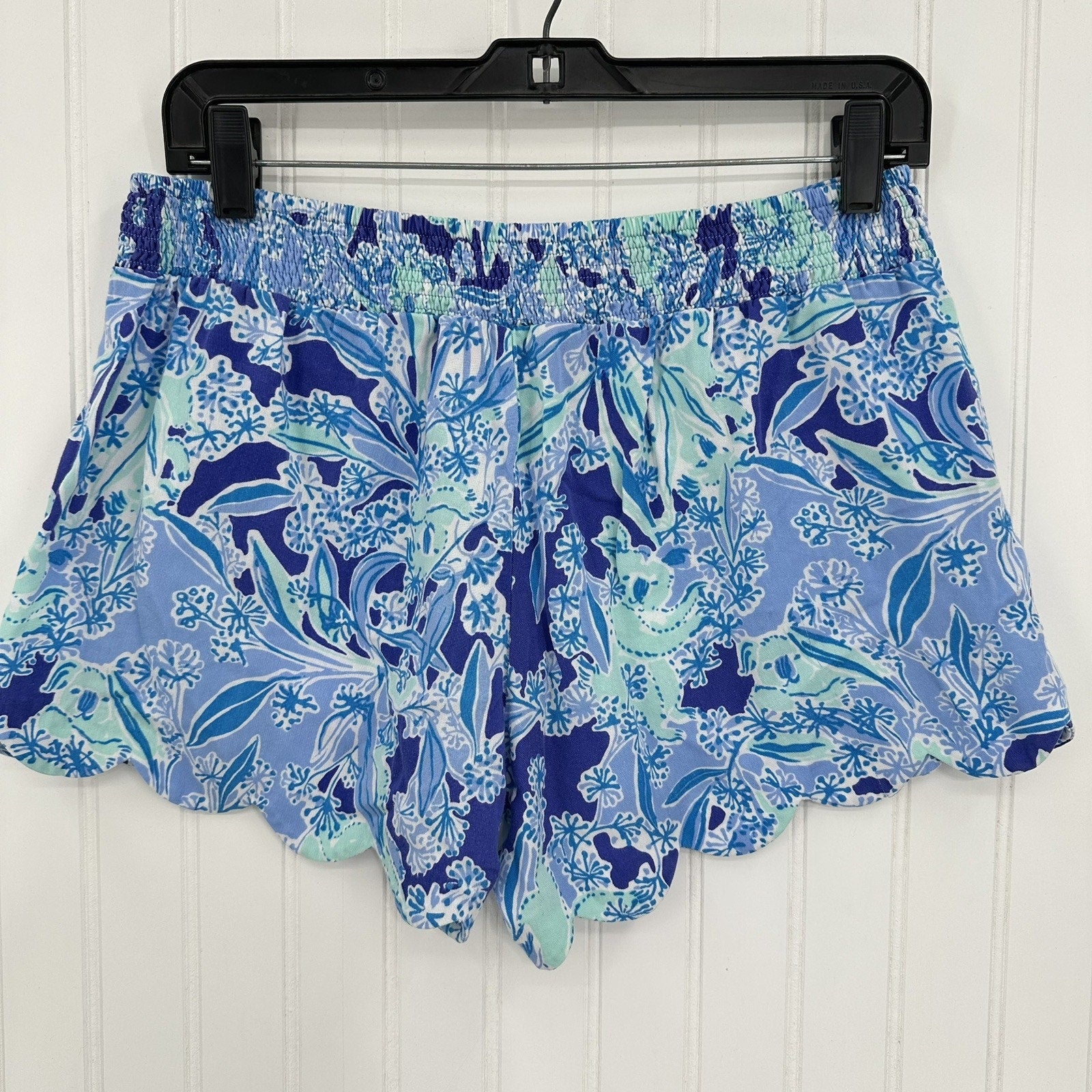 Lilly Pulitzer Shorts Womens Medium Dahlia Koala Floral Scallop Hem Blue Lightweight Coastal Barbie Tropical Beach Vacation