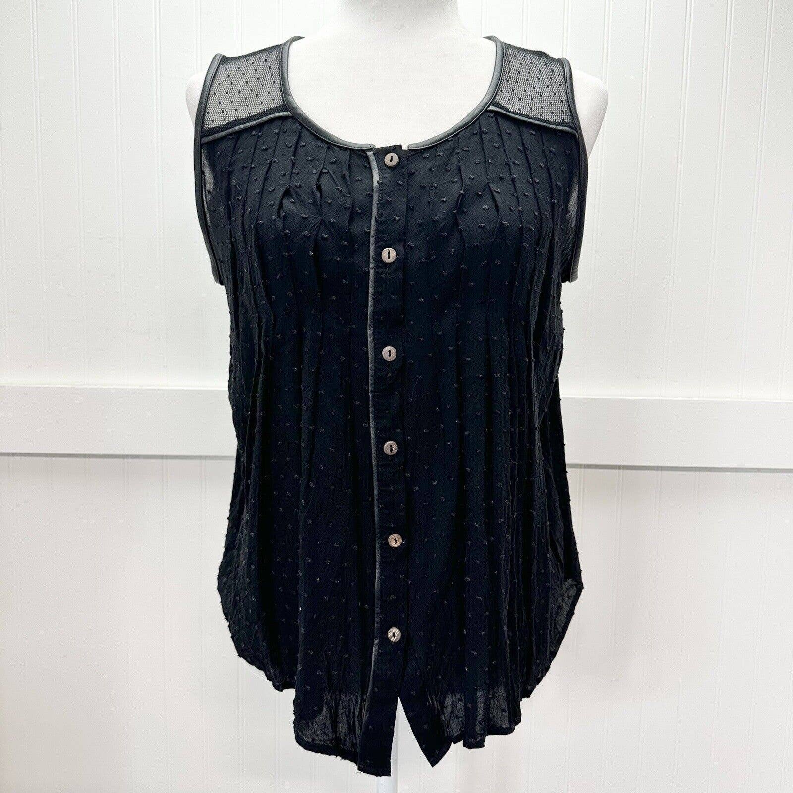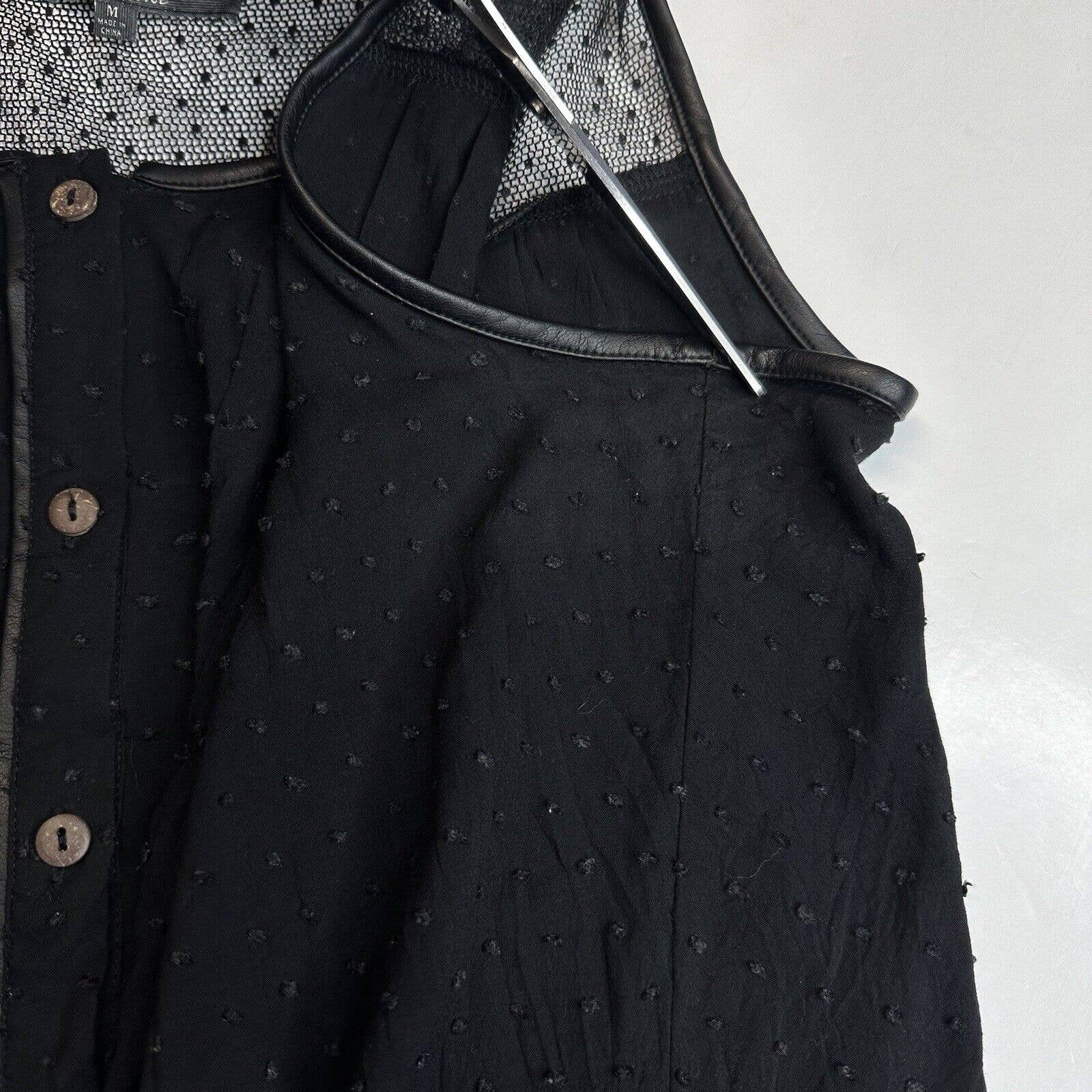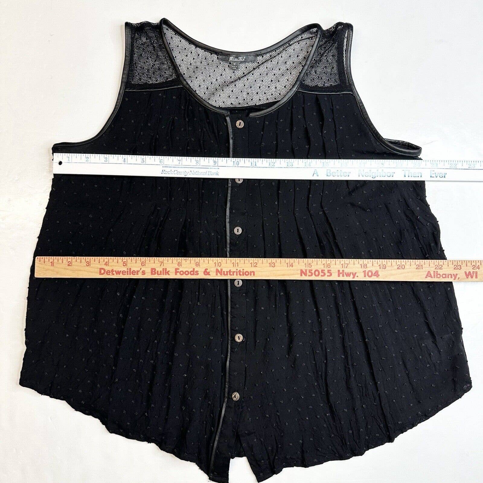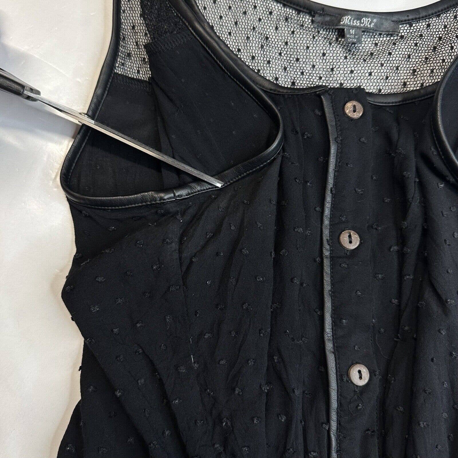 Miss Me Button Up Tank Top Sz Medium Black Sleeveless Faux Leather Trim Sheer