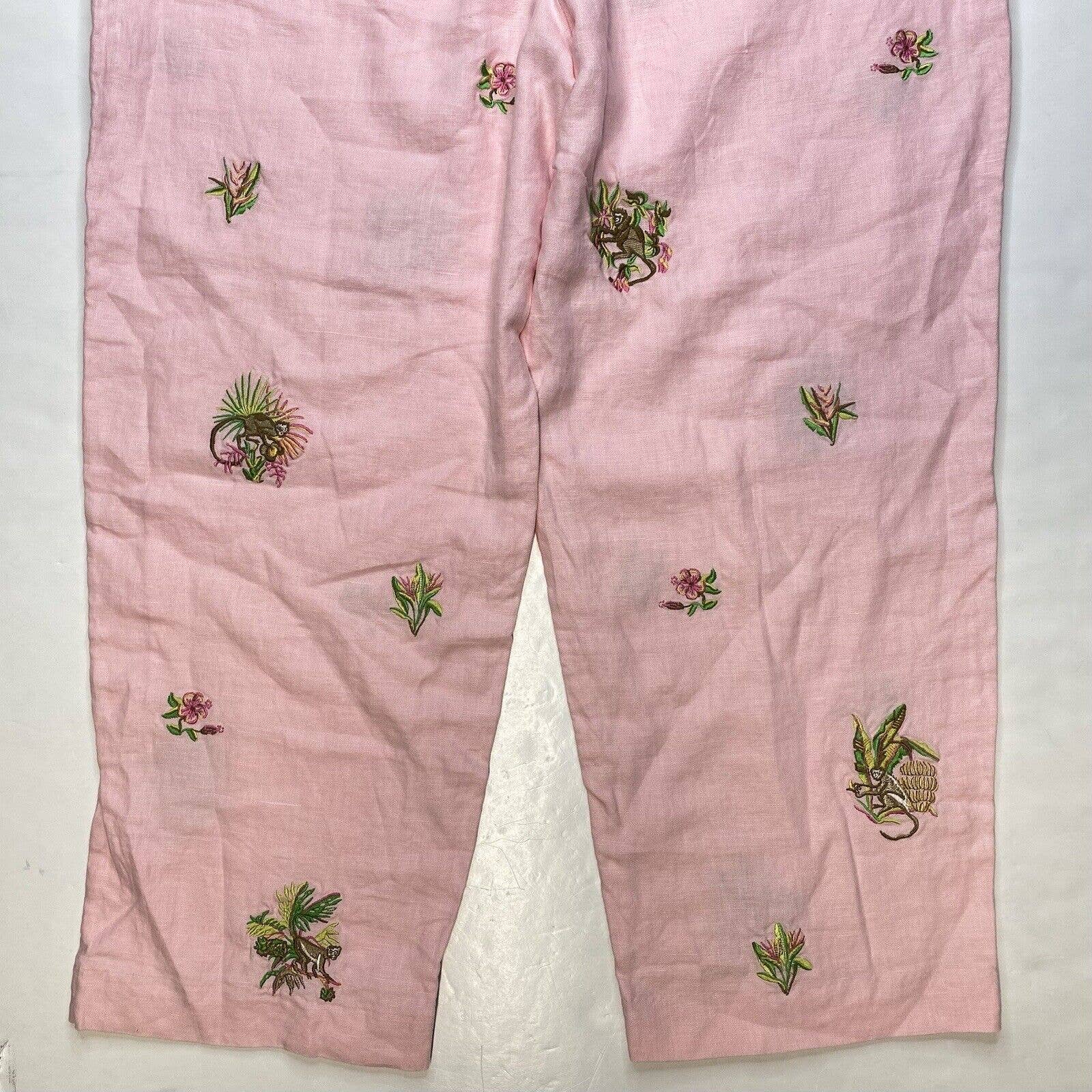 Rosanna 100% Linen Wide Leg Cropped Pants 14 (32"Waist) Pink Embroidered Monkeys Tropical Girly Fun Animal Pants With Pockets And Zipper Closure. Casual Lounge Leisure Beach Summer Vacation