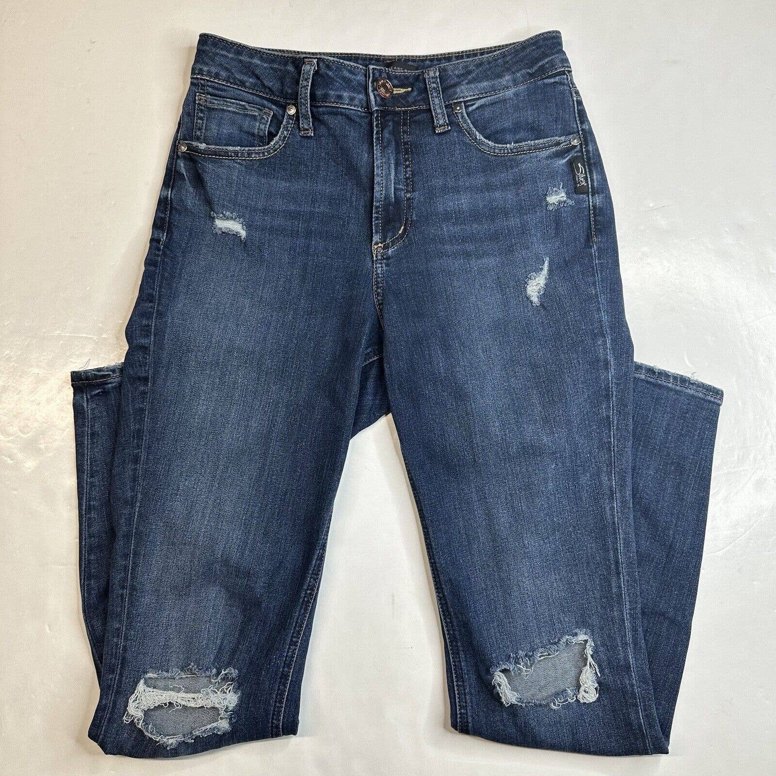 Silver Avery Skinny Jeans Womens Sz 29 Curvy High Rise Stretch Denim Blue Jean Dark Wash Distressed Holes. Buckle
