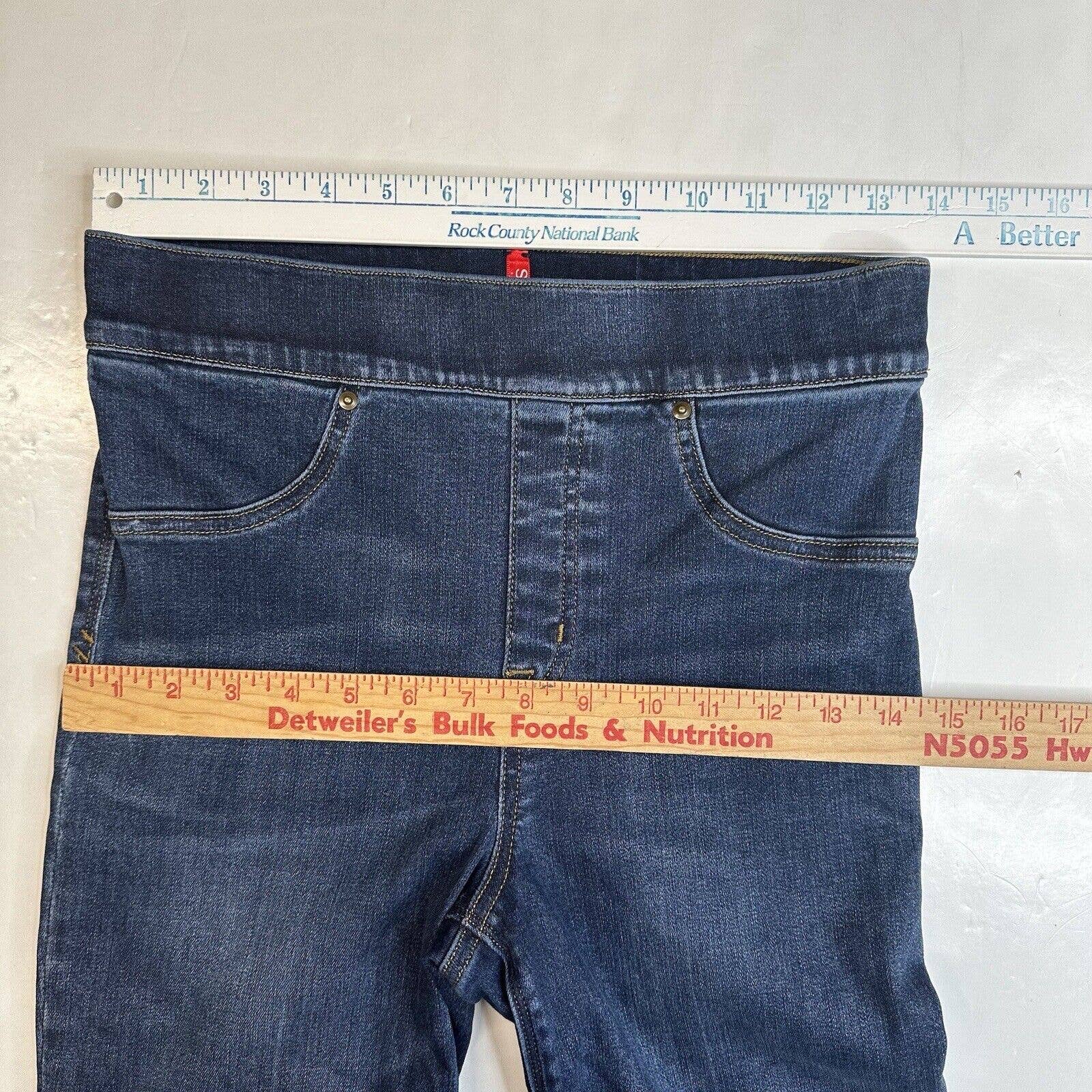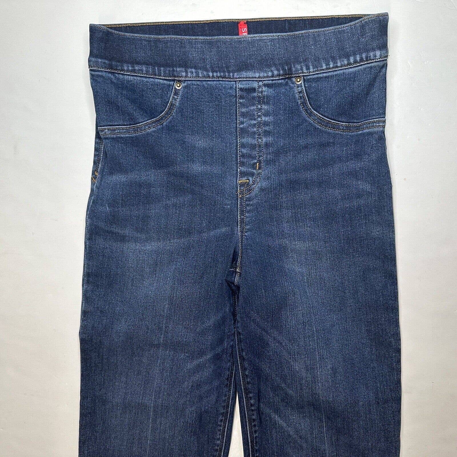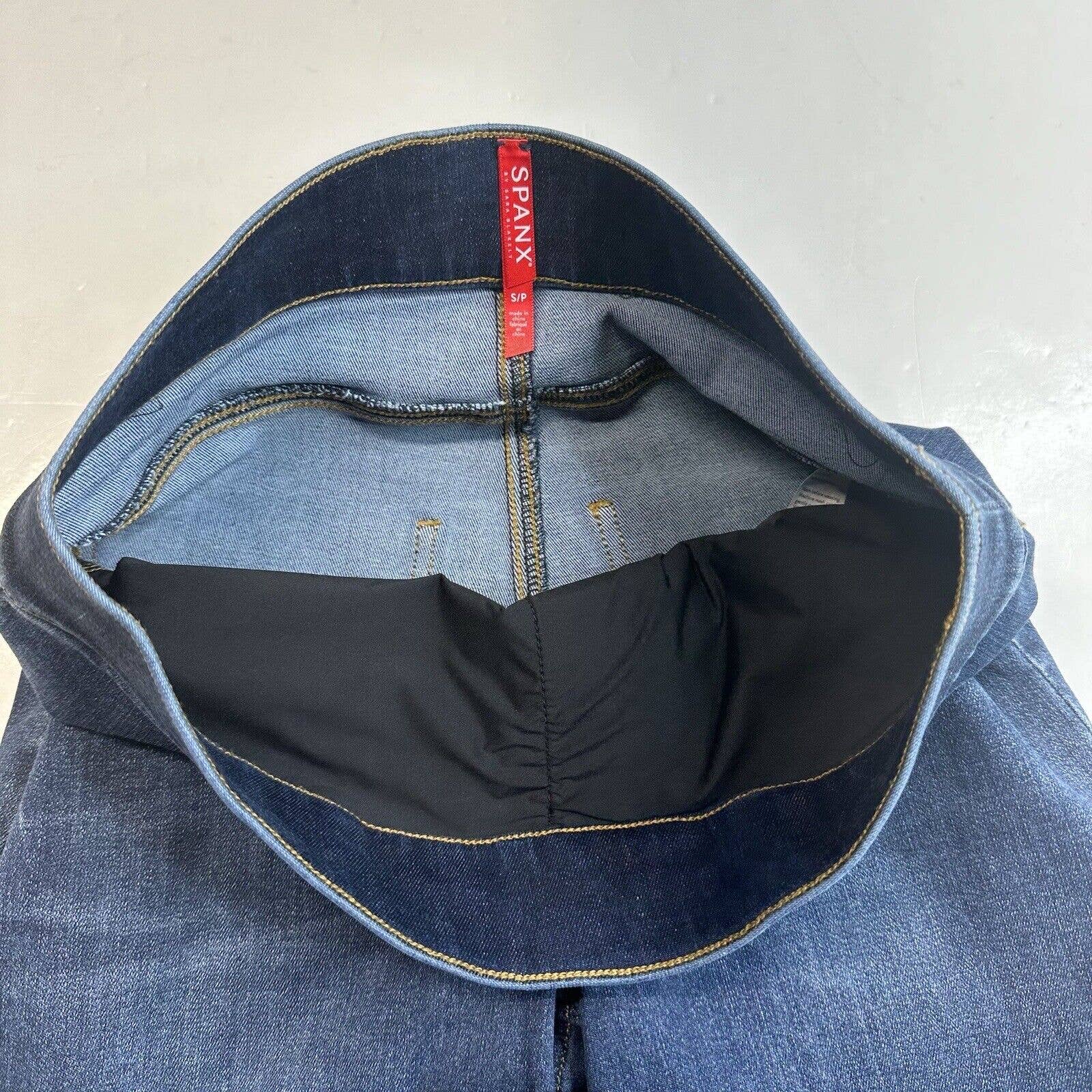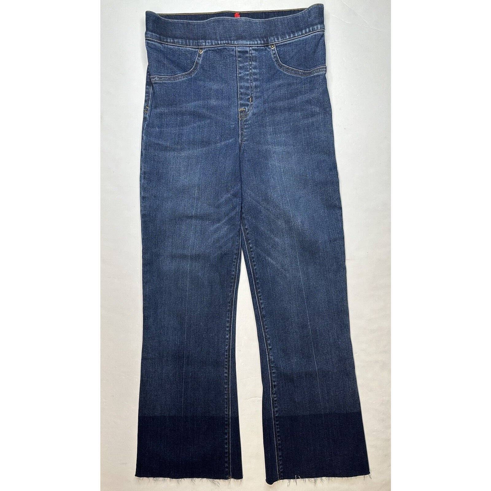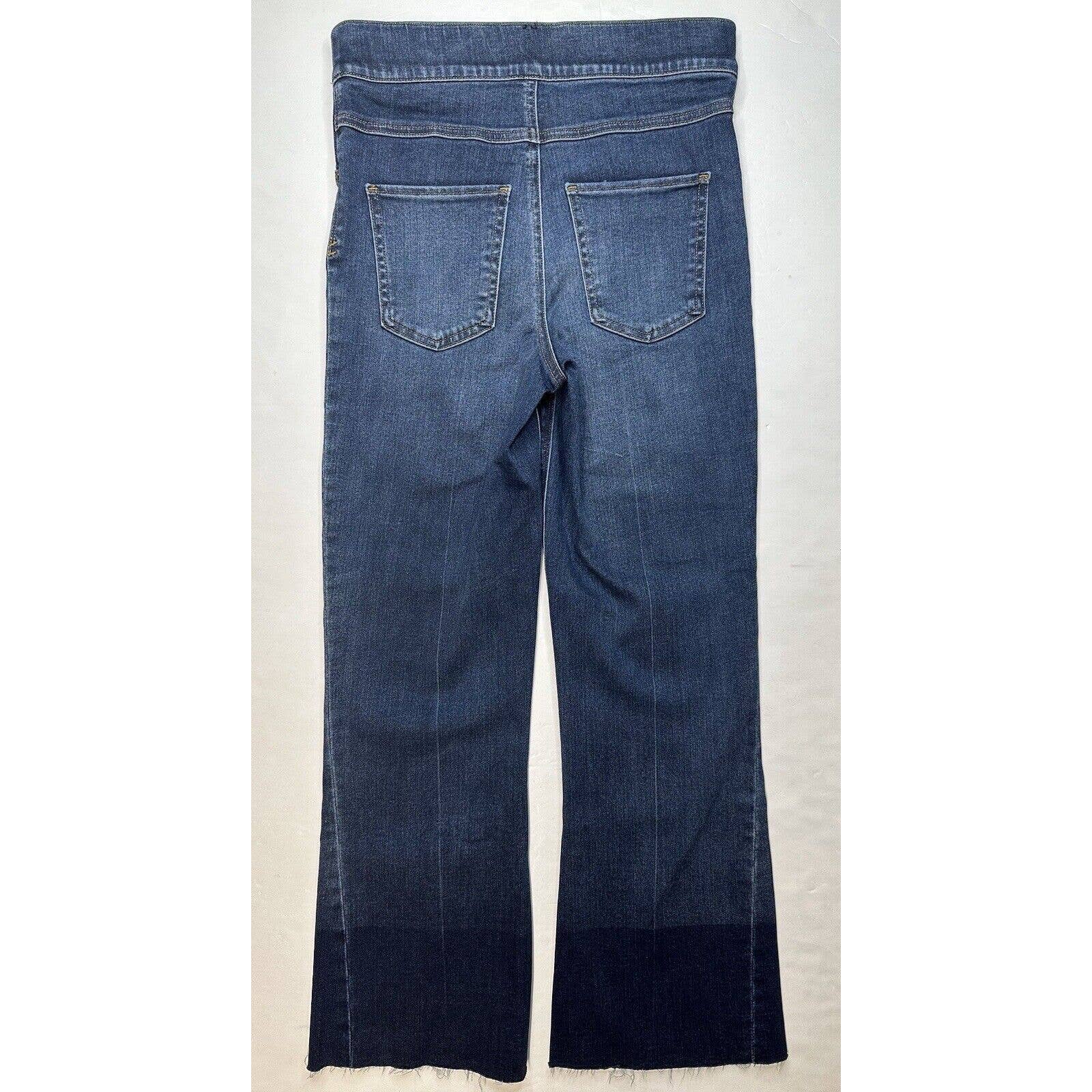 Spanx Cropped Flare Jeans Womens Small Pull On High Rise Stretch Denim Blue Jean Medium/Dark Wash Raw Hem Fray EUC