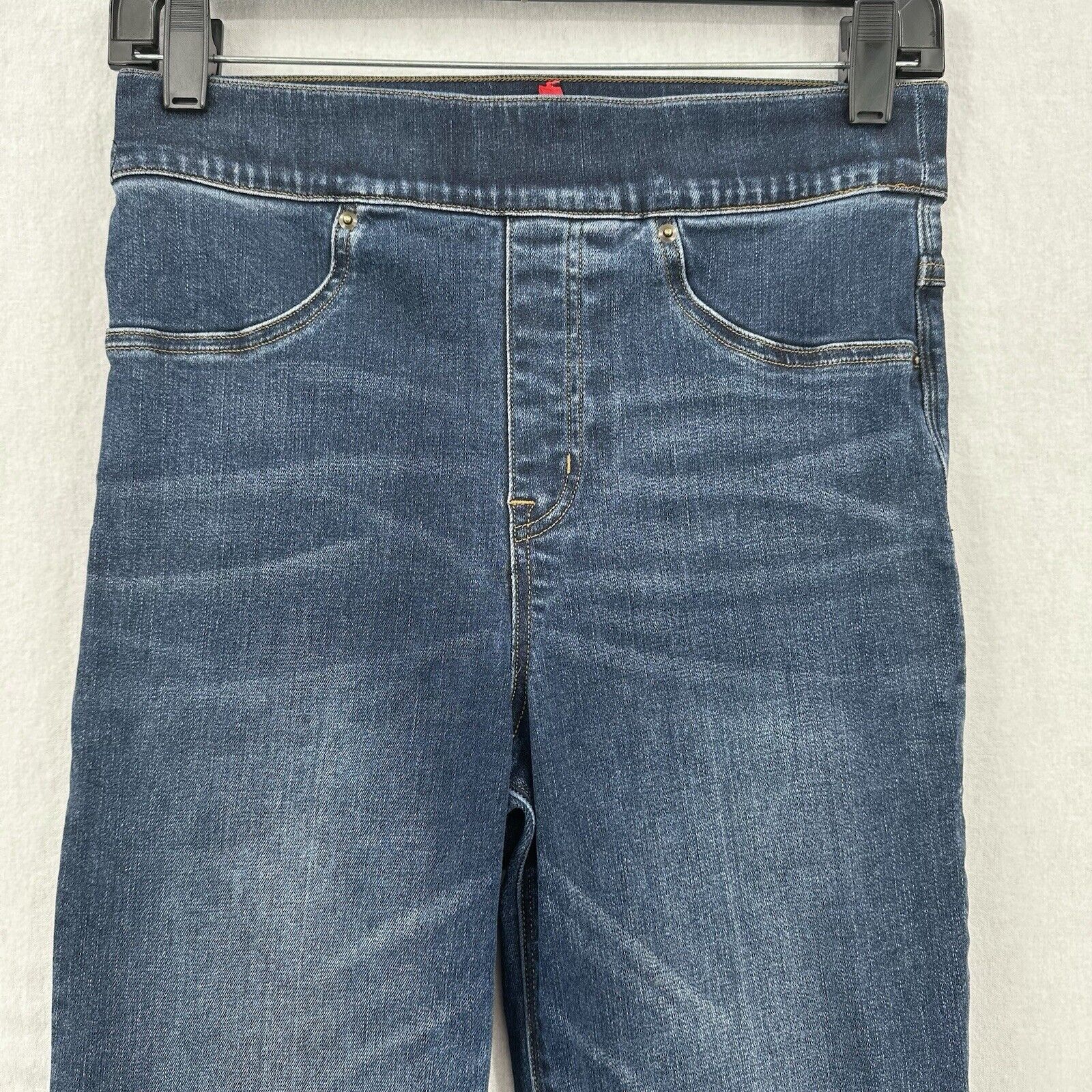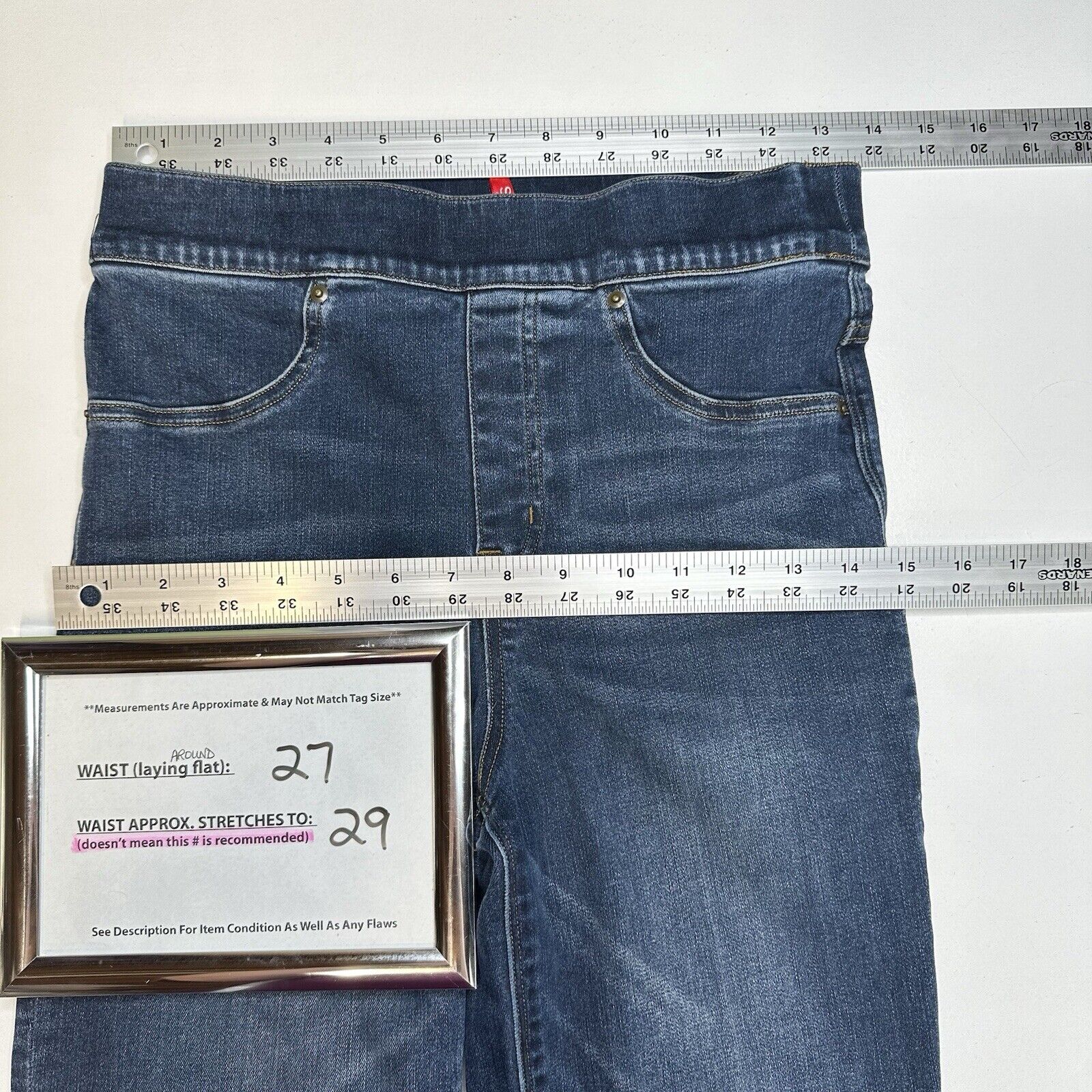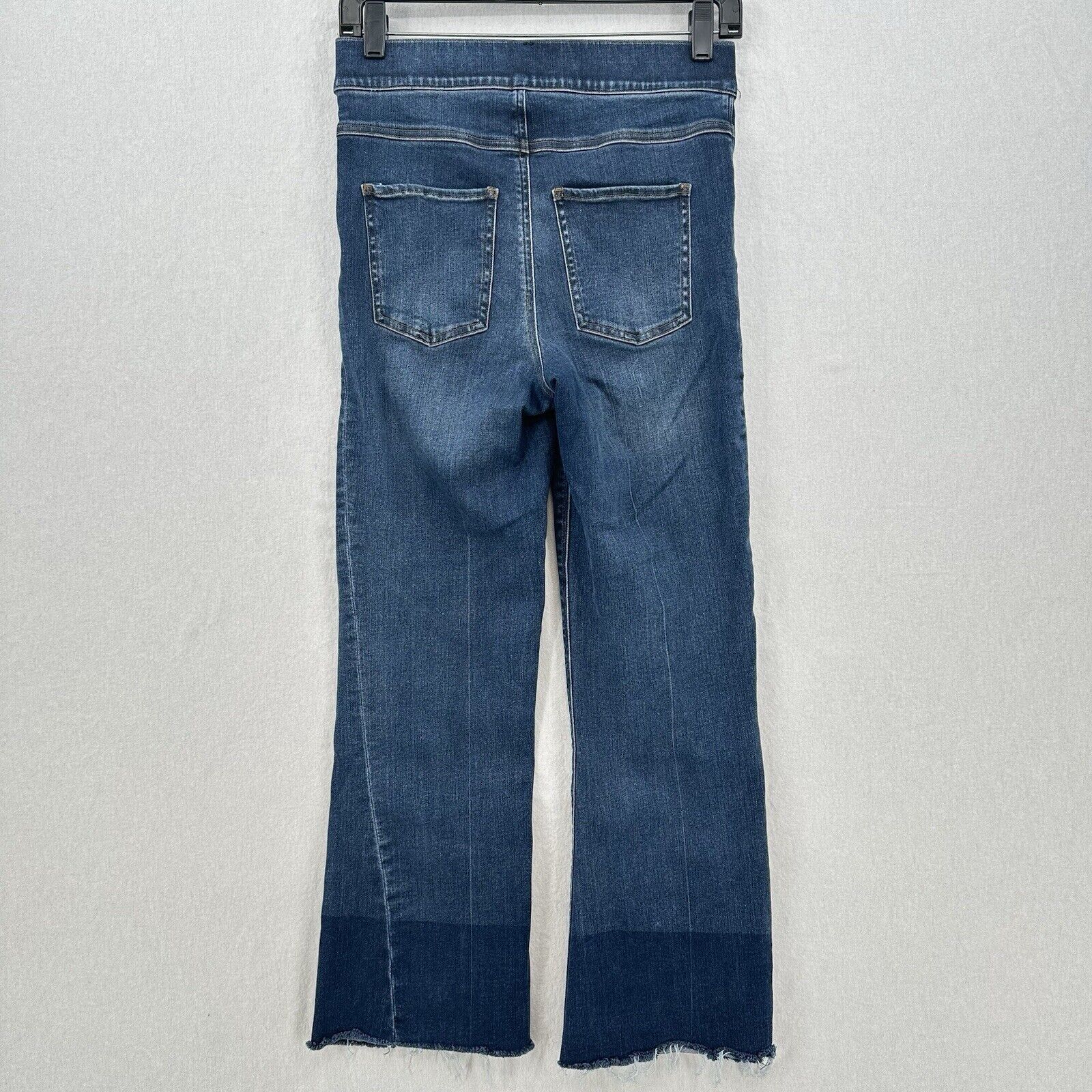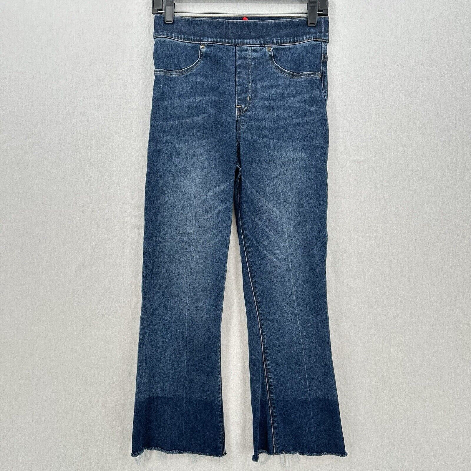 Spanx Cropped Flare Jeans Womens Small Pull On High Rise Stretch Denim Blue Jean Medium Wash Raw Hem Fray EUC